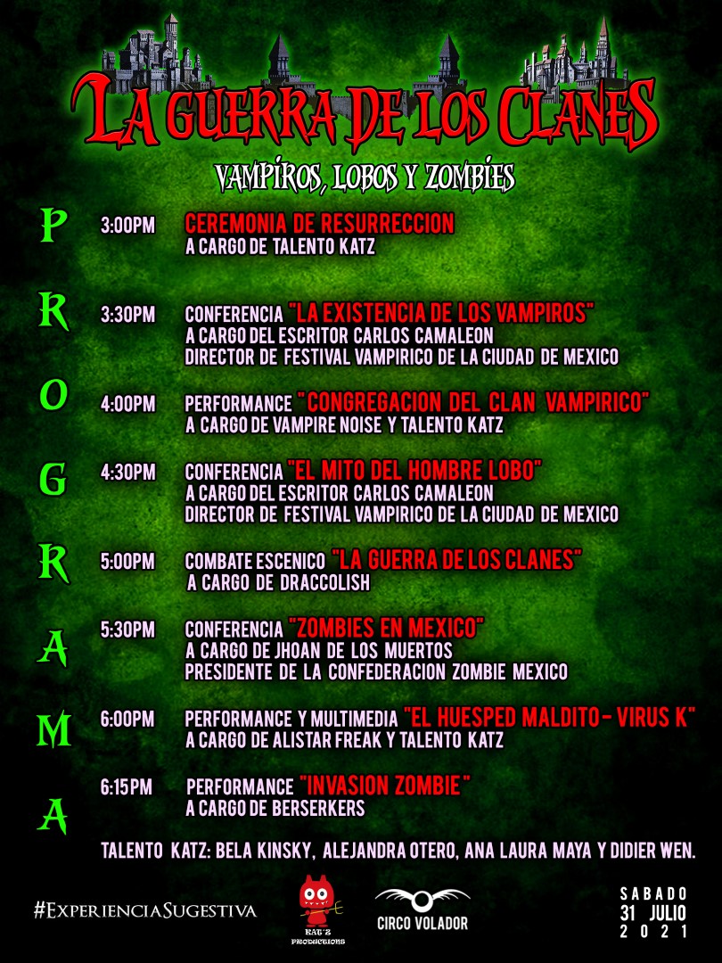 Ahora en una nueva dinámica habrá conferencias, batallas, visuales, performance, libros y artículos.  Si te gusta Resident Evil, Exterminio, Underworld, Entrevista con el Vampiro, Drácula, Van Helsing por mencionar algo, entonces tienes una cita el 31 de Julio. La literatura y artes escénicas, se dan cita en Circo Volador Centro de Arte y Cultura.